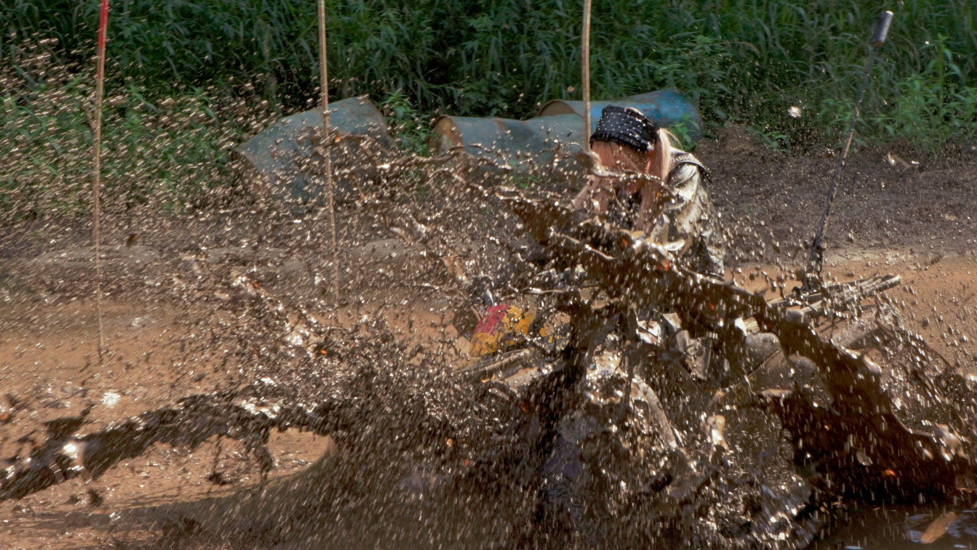 Mari wades deeper into the mud pool, savoring every messy moment as she slowly peels off her drenched uniform, leaving it half-submerged in the swamp. Beneath, her once-white swimsuit has turned a deep earthy brown, showing every trace of her muddy play. With a big smile, she hops back on her buggy for one final lap—splattering mud across her hair and face as she rides through the puddles with full abandon.
