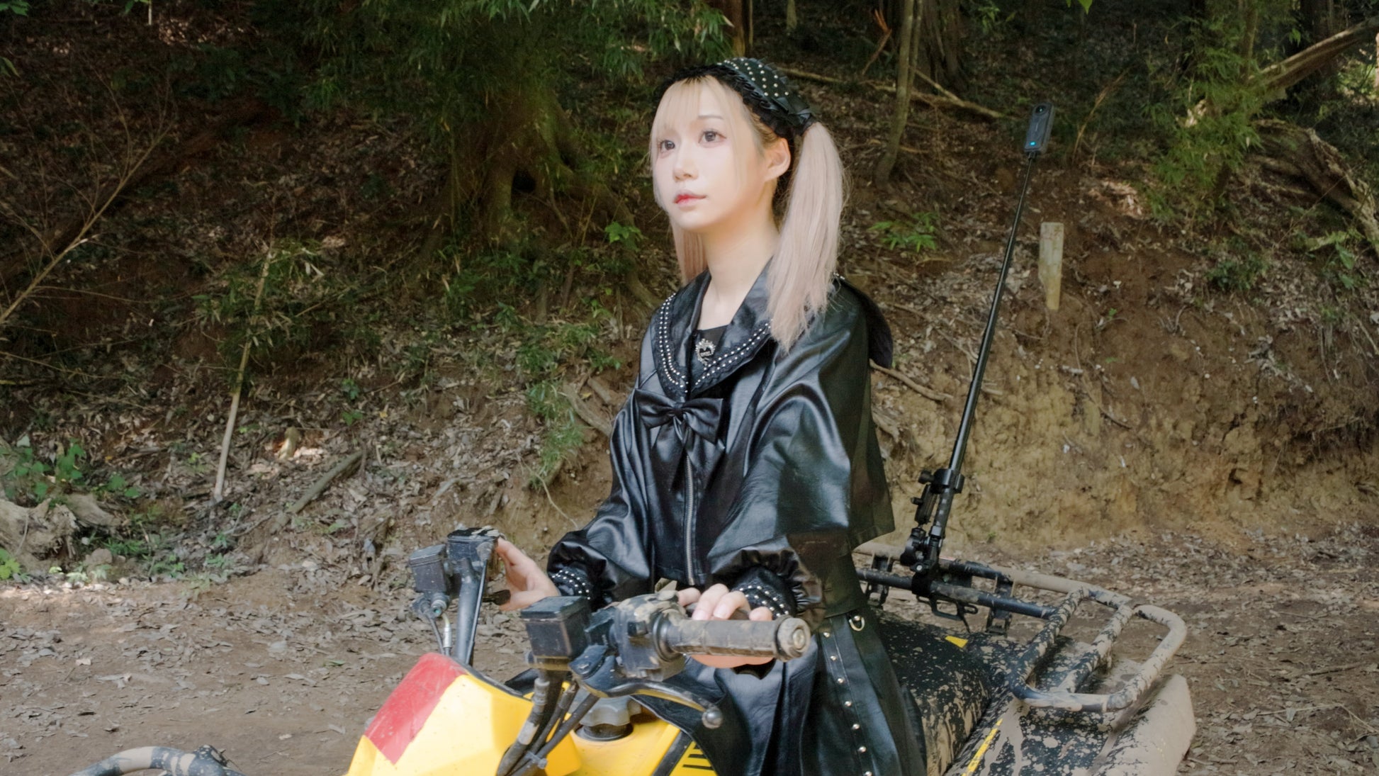 This time she’s styled in a brand-new IMVAL leather sailor uniform - literally fresh from the shop the day before - with a Pharfaite school swimsuit layered underneath. To complete her trendy Jirai-kei look, she mixes leather leg warmers, playful socks, and Yosuke sneakers, blending street and subculture fashion into one daring outfit. The moment she climbs onto the buggy bike, Mari can already feel that this ride will test both her and her glossy new outfit.