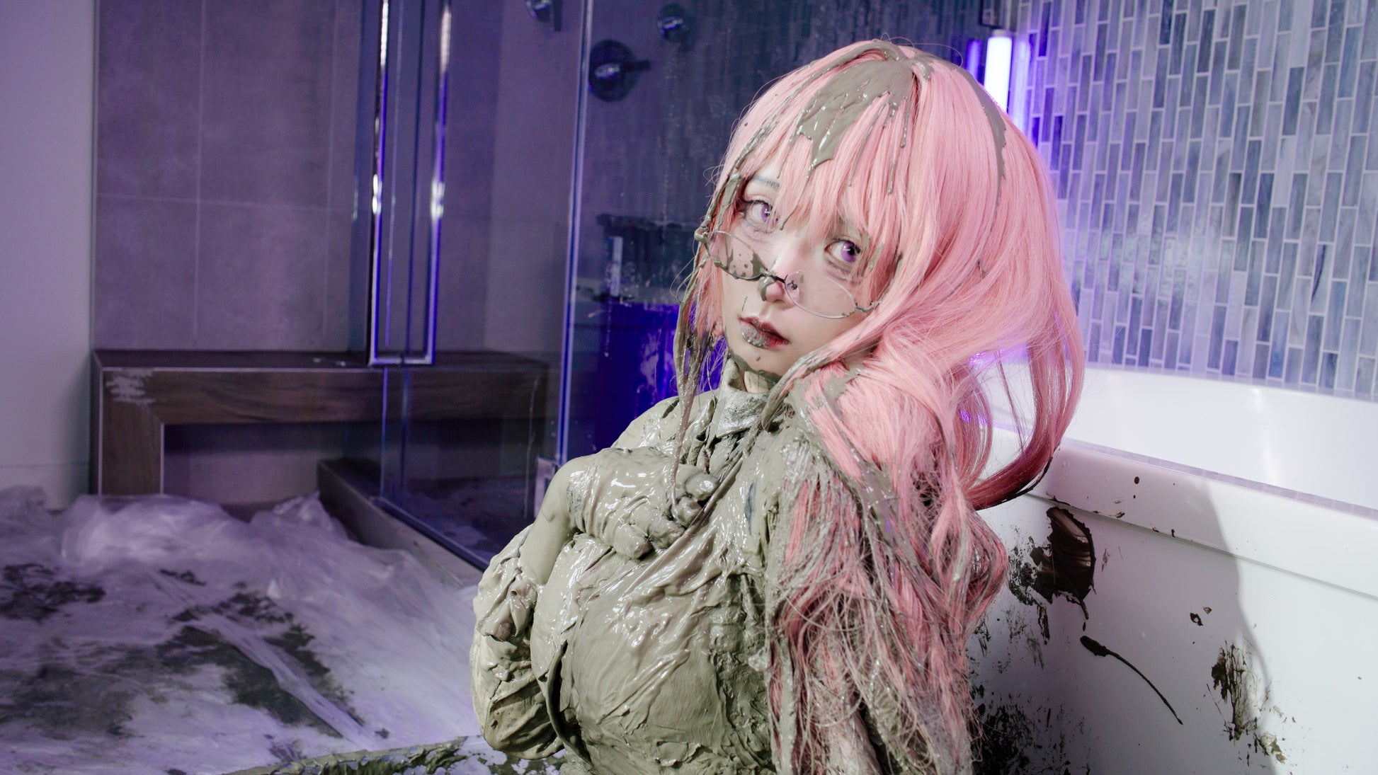 She sets up lotion, slime, and mud for the ultimate relaxation ritual… then dives right in before realizing she’s still wearing half her uniform. Too late — she’s already having the time of her life. By the end, her gear is soaked, stained, and absolutely unrecoverable, so she does the only logical thing: cut it up, trash it, and enjoy the peace of a messy victory.